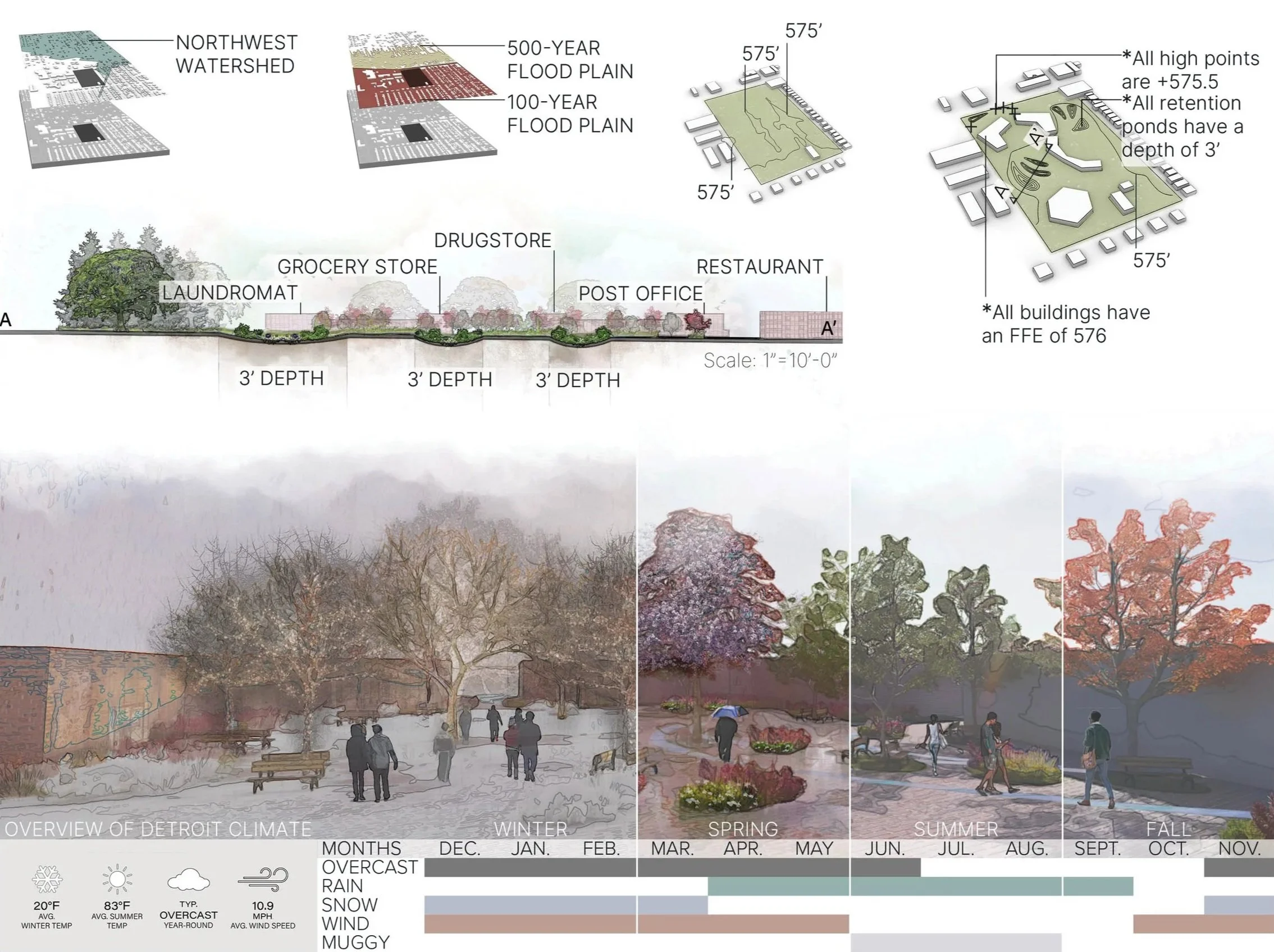 Seasonal climate overview for Detroit. Rendering produced by Nicole Romrell using Rhino, Lumion, InDesign and Photoshop.