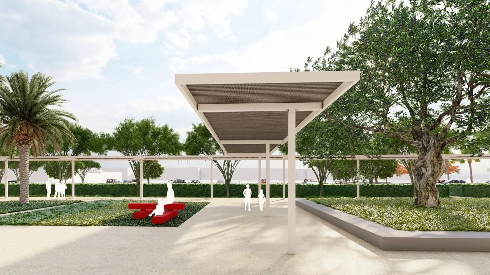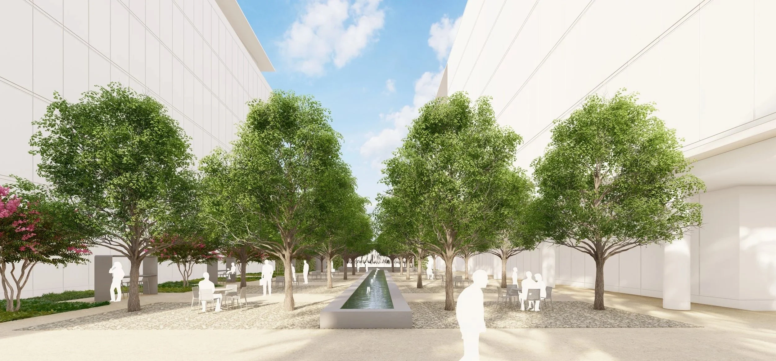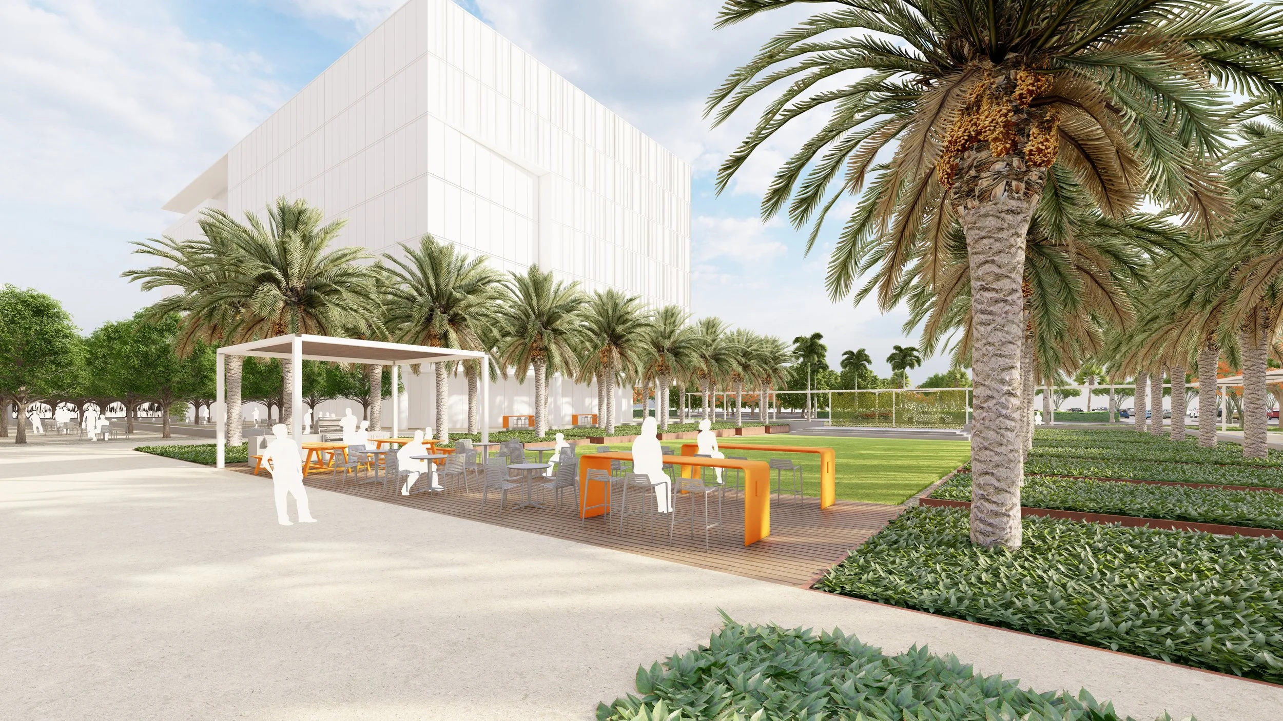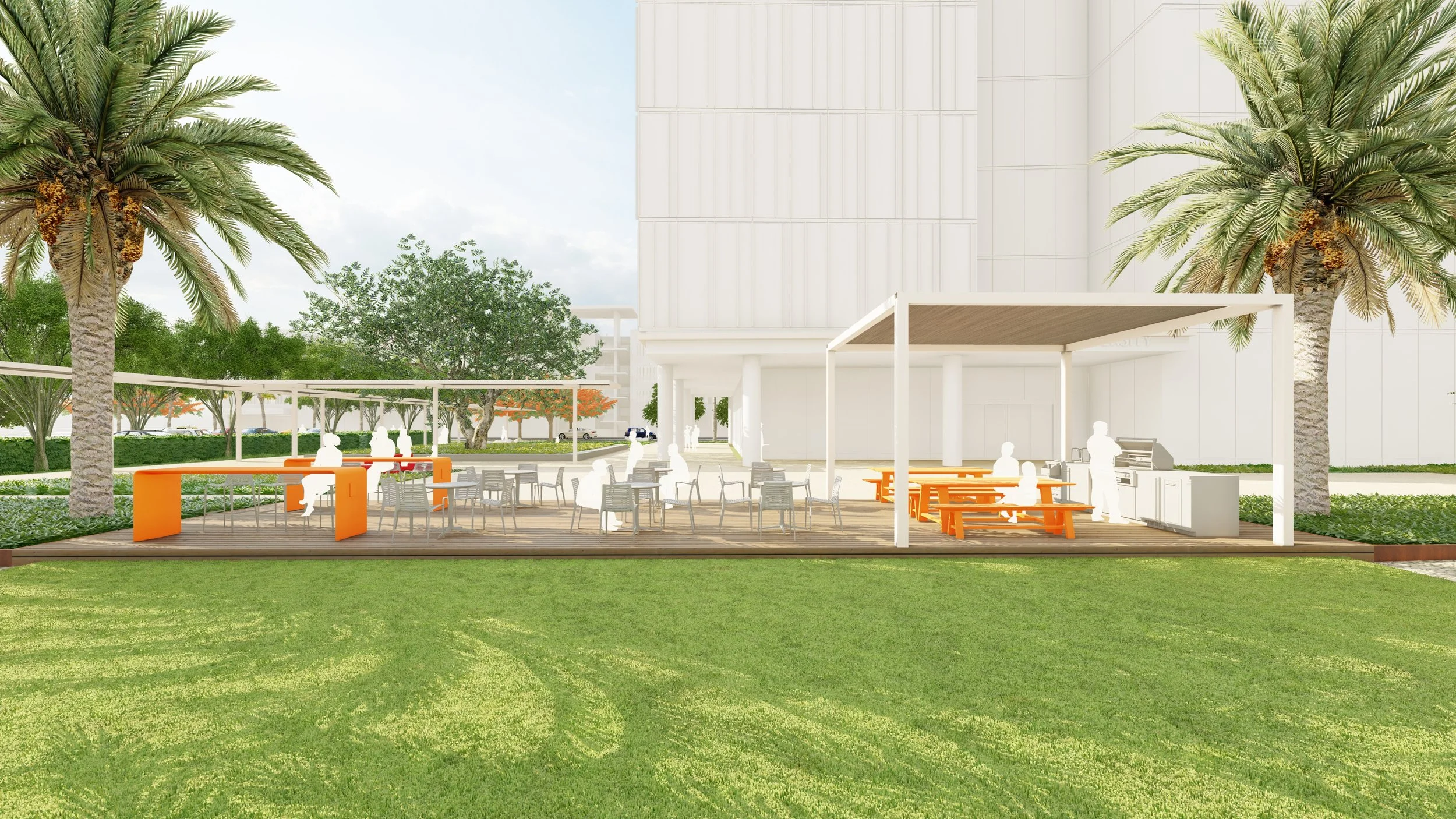 functionality, we incorporated abundant seating and shading elements, as well as a water wall that provides a cooling effect and serves as a noise buffer from the adjacent highway. Additionally, the site features a sloped event lawn with integrated lighting and a shaded outdoor kitchen to accommodate a variety of events.