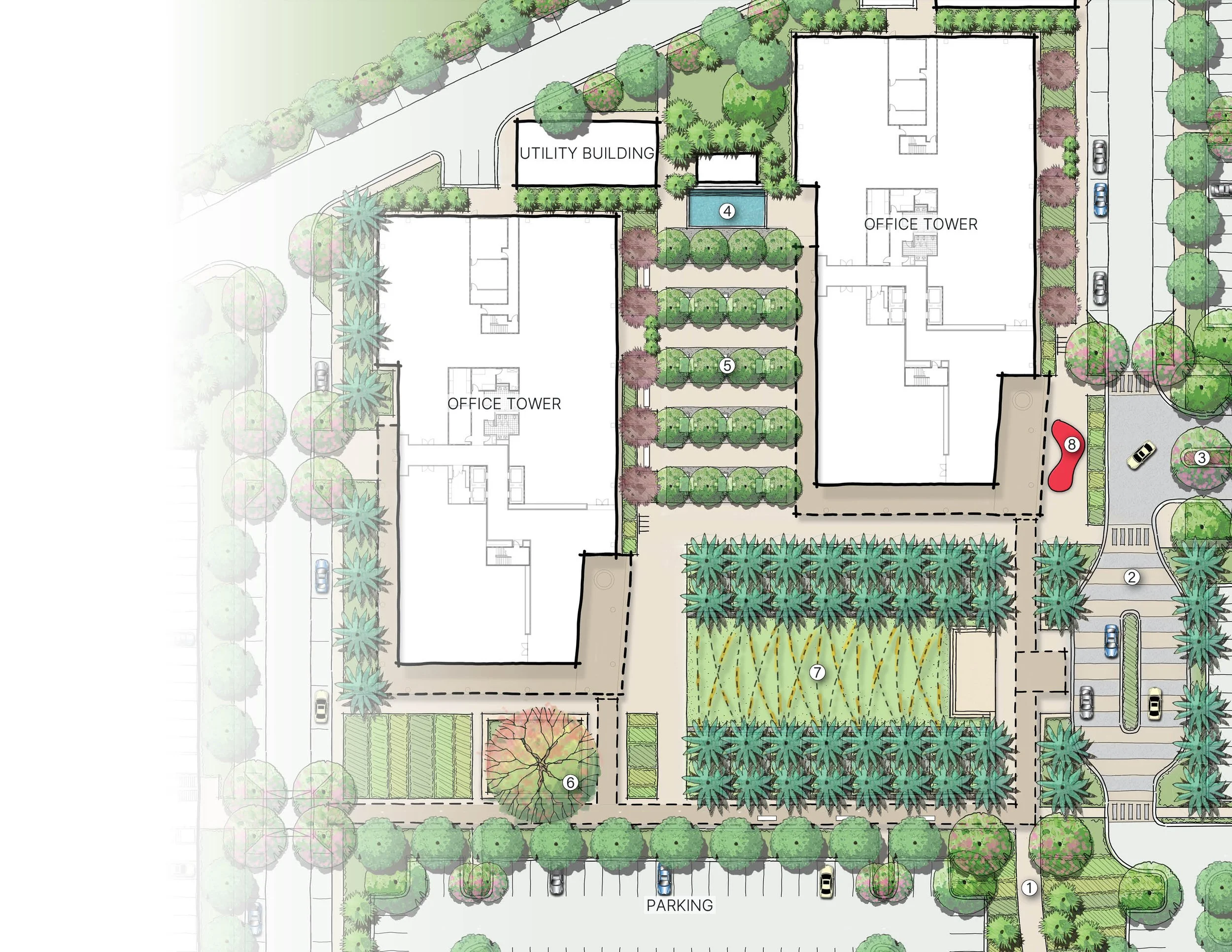 UTC East District is a commercial office campus in Sarasota, FL, featuring two identical office buildings offset from one another. The landscape design includes a permeable pavement tree grove seating area, providing a space for workers to take breaks, enjoy lunch, or take meetings outside. To enhance comfort and