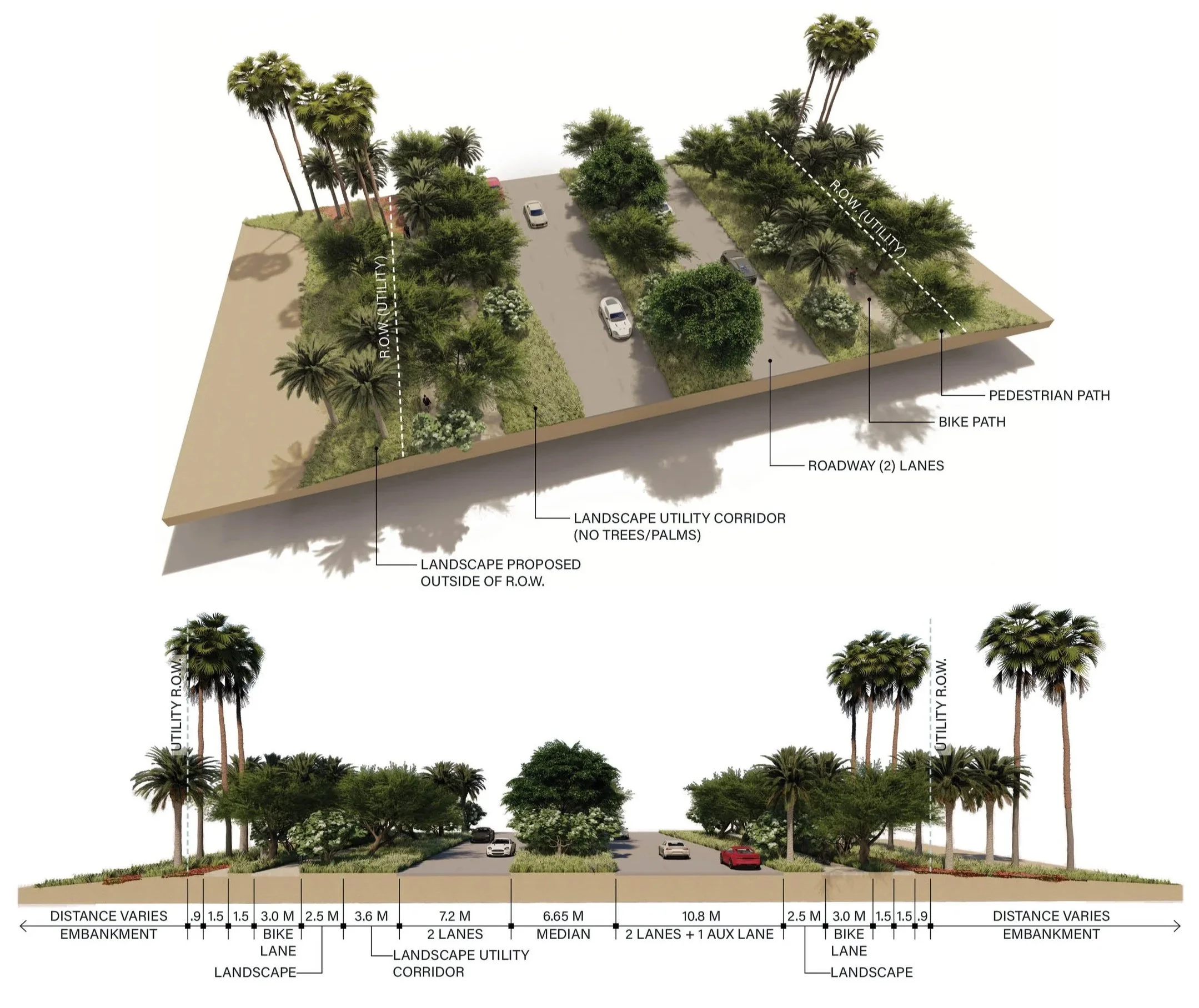 This planting design was later taken into Lumion to produce supporting vignettes and sections showcasing the R.O.W. limits, utility locations, differing lane conditions and planting character.