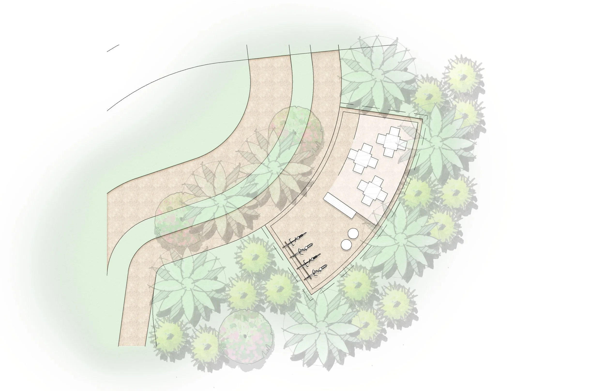 The following diagrams and images represent quick design exercises of the roundabouts and bike rest stops along the hotel spine road developed for client approval.
